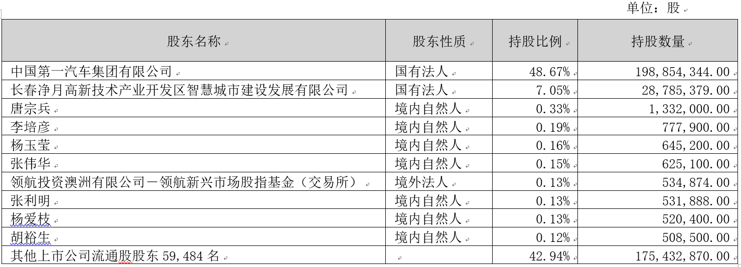 锦鲤体育信息技术股份有限公司(以下简称“公司”)2008年5月9日在深圳证券交易所挂牌上市,股票简称“锦鲤体育信息”,股票代码为:002232,目前为深交所主板上市公司。截至2022年9月30日,公司共有股东59,494名,公司控股股东及实际控制人为中国第一汽车集团有限公司,具体股权结构如下表: